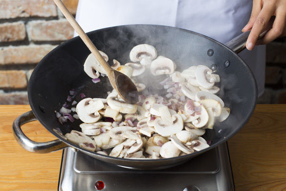 Die Champignons und die Zwiebeln in einer großen Pfanne mit 1EL Olivenöl bei starker Hitze ca. 3Min. von allen Seiten scharf anbraten. Dabei nicht zu häufig wenden, damit die Pilze schön bräunen.