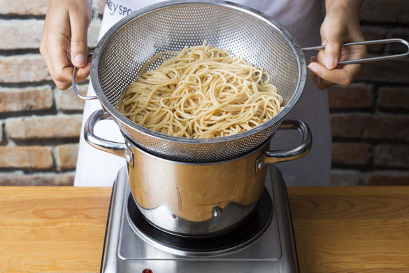 Die Pasta in das kochende Wasser geben und in 7–9Min. bissfest kochen. Mit einer Tasse etwas Pastawasser abschöpfen, dann die Pasta in ein Sieb abgießen, abtropfen lassen, zurück in den Topf geben und warm halten. Den Käse fein reiben.