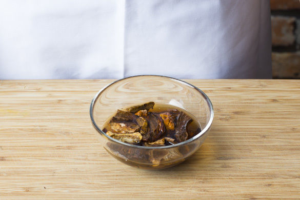 In einem mittelgroßen Topf ausreichend gesalzenes Wasser für die Pasta zum Kochen bringen. Die Shiitake in 100ml heißem Wasser 8–10Min. einweichen.