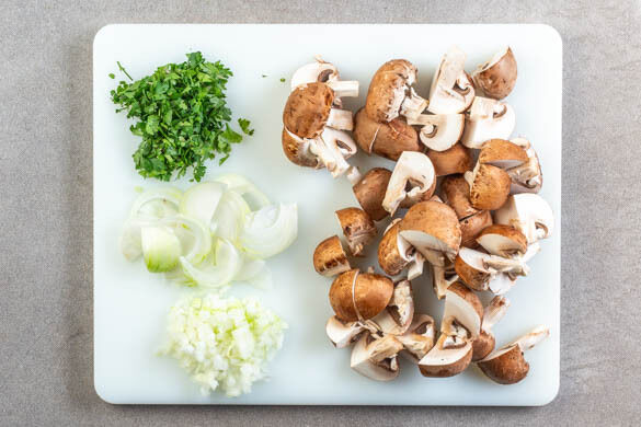 In einem mittelgroßen Topf ausreichend leicht gesalzenes Wasser für die Kartoffeln zum Kochen bringen. Die Pilze ggf. säubern und vierteln. Die Zwiebel schälen, halbieren und eine Hälfte in Würfel, die andere Hälfte in dünne Streifen schneiden. Die Petersilie samt Stängeln fein hacken.