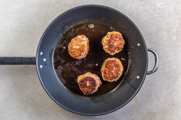 Die Bouletten in einer mittelgroßen Pfanne mit 1EL Pflanzenöl bei mittlerer Hitze auf jeder Seite 5–7Min. braten, bis das Fleisch durch ist. Dann aus der Pfanne nehmen und auf einem Teller abgedeckt warm halten.