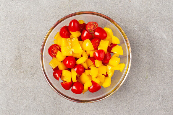 Die Paprika vierteln, entkernen und grob würfeln. Die Kirschtomaten halbieren.