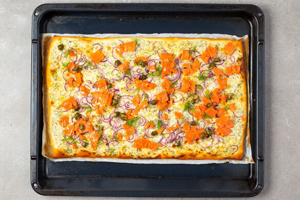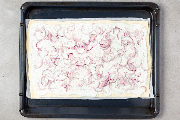 Die Dillcreme auf dem Teig verstreichen, dabei an den Rändern ca. 1cm frei lassen. Die Zwiebel schälen, halbieren, in dünne Streifen schneiden und auf der Creme verteilen. Die Pizza im Ofen in 15–20Min. goldbraun und knusprig backen.