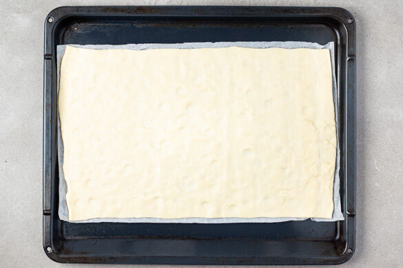 Den Teig mit dem Papier nach unten auf einem Backblech ausrollen und mit den Fingerspitzen leicht eindrücken.