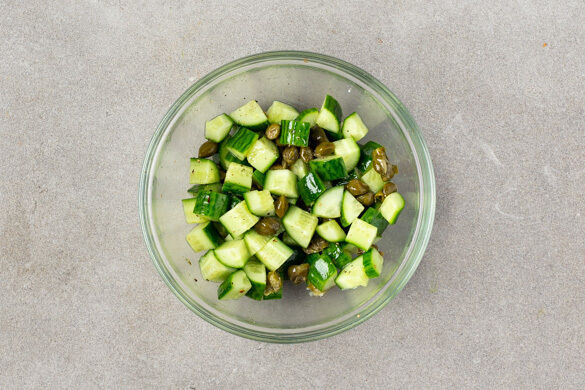 Die Gurke längs vierteln und in kleine Würfel schneiden. Die Oliven grob hacken. Die ½ der Oliven mit den Gurken, 1EL Olivenöl und 1EL Essig verrühren. Dann die Paprika, die Tomaten und die ½ des restlichen Dills untermengen und den Salat mit Salz und Pfeffer abschmecken.
