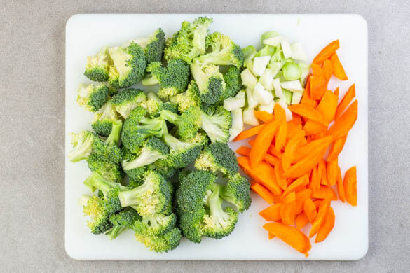 Die Karotten ggf. schälen, längs halbieren und schräg in dünne Scheiben schneiden. Den Brokkoli in mundgerechte Röschen schneiden, den Strunk ggf. schälen und in ca. 1cm große Würfel schneiden.
