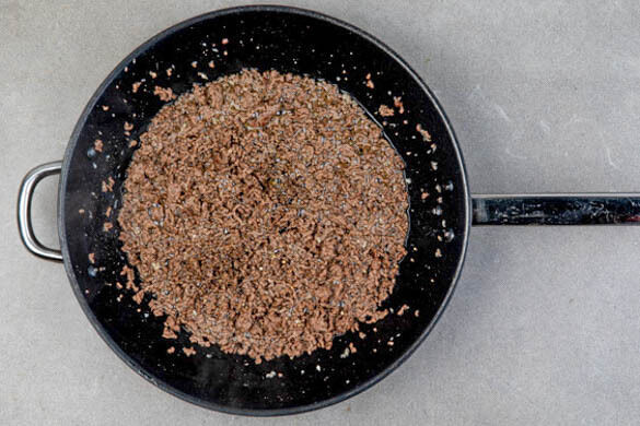 Das Hackfleisch in einer mittelgroßen Pfanne mit 1EL Olivenöl und der Gewürzmischung bei starker Hitze in 3–4Min. krümelig anbraten, dann mit 1EL Essig ablöschen. Vom Herd nehmen und den Spinat unterheben, bis er zusammenfällt. Mit Salz abschmecken.