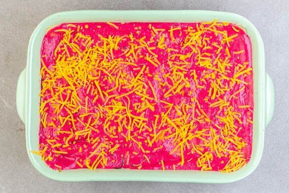 In einer mittelgroßen Auflaufform nacheinander etwas Rote-Bete-Béchamel, eine Schicht Lasagneplatten und etwas Hackfleisch-Spinat-Mischung schichten. Den Vorgang 3–5 Mal wiederholen, bis die Hackfleisch-Spinat-Mischung aufgebraucht ist. Mit einer Schicht Rote-Bete-Béchamel abschließen und den Käse über die Lasagne streuen.