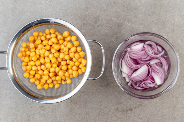 Die Zwiebeln schälen, halbieren und in feine Streifen schneiden. Bis zum Servieren in eine Schüssel mit kaltem Wasser geben. Die Kichererbsen in einem Sieb mit kaltem Wasser abspülen und abtropfen lassen.
