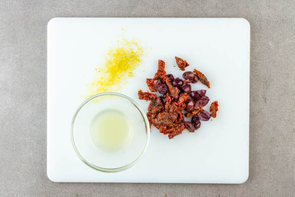 Die getrockneten Tomaten und die Oliven grob schneiden. Die Schale von 1 Zitrone abreiben, dann beide Zitronen halbieren und auspressen.