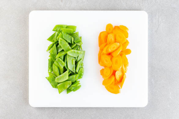 Die Karotten ggf. schälen und schräg in dünne Scheiben schneiden. Die Kaiserschoten ggf. von holzigen Enden befreien und schräg halbieren.