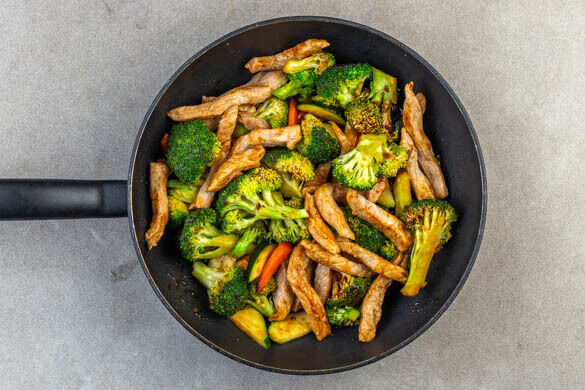 Den Brokkoli und die Karotten in denselben Pfannen mit 4EL Pflanzenöl bei starker Hitze 3–4Min. anbraten, bis sie leicht weich werden. Die Zucchini zugeben und weitere 2–3Min. braten, bis das Gemüse gar ist. Die Sauce angießen und aufkochen.