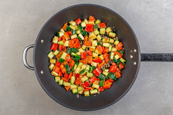 Die Schalotten und den Knoblauch in einer großen Pfanne oder einem Wok mit 1EL Olivenöl bei mittlerer Hitze ca. 1Min. anschwitzen. Die Paprika und die Zucchini dazugeben und 6–8Min. mitbraten.