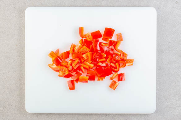 Die Paprika vierteln, entkernen und in 1–2cm große Stücke schneiden.