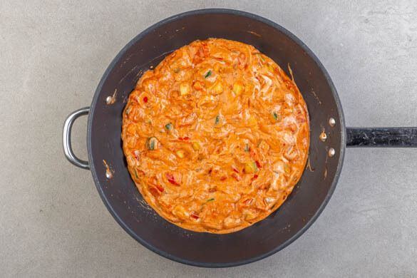 Die Pfanne vom Herd nehmen, die passierten Tomaten und die Crème fraîche unter das Gemüse rühren und die Sauce mit der Gewürzmischung sowie Salz und Pfeffer abschmecken.