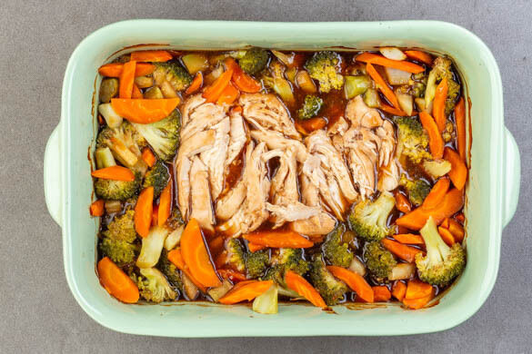 Den Boden einer großen Auflaufform mit 1TL Pflanzenöl bestreichen. Das Fleisch trocken tupfen und ohne Überlappen in der Mitte der Aufflaufform platzieren. Das Gemüse um das Fleisch herum verteilen, mit ½TL Salz würzen und die Sauce darüber gießen. Mit Alufolie abdecken und im Ofen 30–35Min. backen, bis das Fleisch gar und das Gemüse weich ist.
