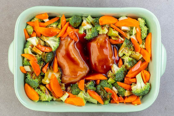 Den Boden von zwei Auflaufformen jeweils mit 1TL Pflanzenöl bestreichen. Das Fleisch trocken tupfen und ohne Überlappen in der Mitte der Aufflaufformen platzieren. Das Gemüse um das Fleisch herum verteilen, mit ½TL Salz je Form würzen und die Sauce darüber gießen. Mit Alufolie abdecken und im Ofen 30–35Min. backen, bis das Fleisch gar und das Gemüse weich ist.
