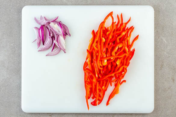 Die ½ der Zwiebel schälen und in feine Streifen schneiden. Die übrige Zwiebel wird für dieses Rezept nicht benötigt. Die Paprika vierteln, entkernen und in dünne Streifen schneiden.