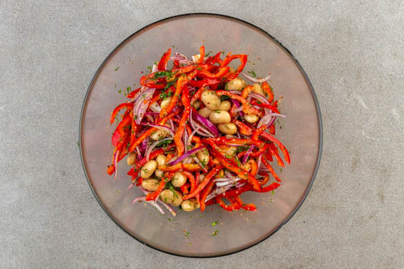 Währenddessen die Bohnen in einem Sieb mit kaltem Wasser abspülen und abtropfen lassen. Den Dill samt Stängeln grob schneiden. Die Paprika, die Bohnen und den Dill mit dem Dressing vermengen und mit Salz und Pfeffer abschmecken.