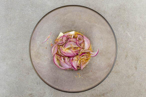 4EL Olivenöl, 4EL hellen Essig (am besten Apfelessig), 1EL grobkörnigen Senf, 1TL Zucker und je ½TL Salz und Pfeffer zu einem Dressing verrühren. Mit den Zwiebelstreifen vermengen und beiseitestellen.