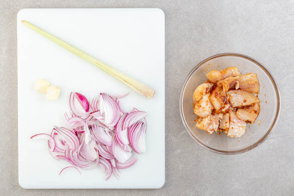 Inzwischen das Zitronengras von den äußeren Blättern befreien und einige Male mit dem Boden einer Pfanne leicht flach klopfen. Die Zwiebel schälen, halbieren und in feine Streifen schneiden. Den Knoblauch schälen und horizontal halbieren. Den Fisch mit kaltem Wasser abspülen, trocken tupfen und mit dem Sambal Badjak und 1EL Pflanzenöl vermengen.