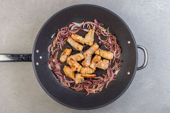 Die Zwiebeln in einer großen Pfanne mit 2EL Pflanzenöl bei mittlerer Hitze in ca. 1Min. glasig anbraten. Die Zwiebeln an den Rand der Pfanne schieben, den Fisch hinzugeben und 2–3Min. rundum braten, bis die Sambal-Marinade leicht karamellisiert ist. Mit Salz und Pfeffer abschmecken.