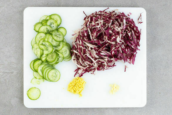 Die Gurken in hauchdünne Scheiben schneiden oder hobeln. Den Chicorée in feine Streifen schneiden.