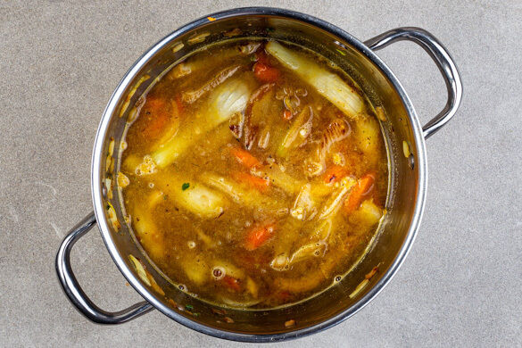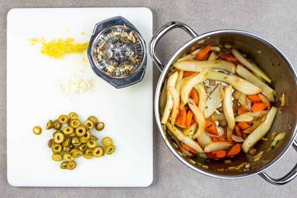 Die Zwiebeln, den Fenchel, die Karotten und die Petersilienstängel in einem mittelgroßen Topf mit 2EL Olivenöl bei mittlerer bis niedriger Hitze 10–14Min. braten, dabei gelegentlich umrühren. Inzwischen die Oliven in Ringe schneiden. Den Knoblauch schälen und fein würfeln. Die Zitronenschale abreiben, dann die Zitrone halbieren und auspressen.