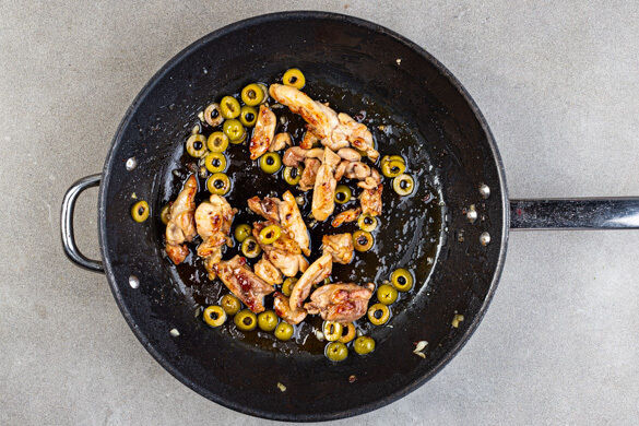 Das Fleisch trocken tupfen, in ca. 1cm breite Streifen schneiden und in der Pfanne mit 1EL Butter bei mittlerer Hitze 6–7Min. goldbraun braten. Den Knoblauch ca. 30Sek. mitbraten. Die ½ des Zitronensafts, die Oliven, 1EL Honig und ½TL Salz zugeben und alles weitere 4–5Min. garen, bis die klebrige Sauce das Fleisch vollständig bedeckt. Mit Salz und Pfeffer abschmecken.