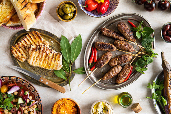 Die Steaks und die Spieße nach Belieben z. B. mit einem leckeren Bulgur- oder Kichererbsensalat oder Brot und Hummus anrichten und servieren.