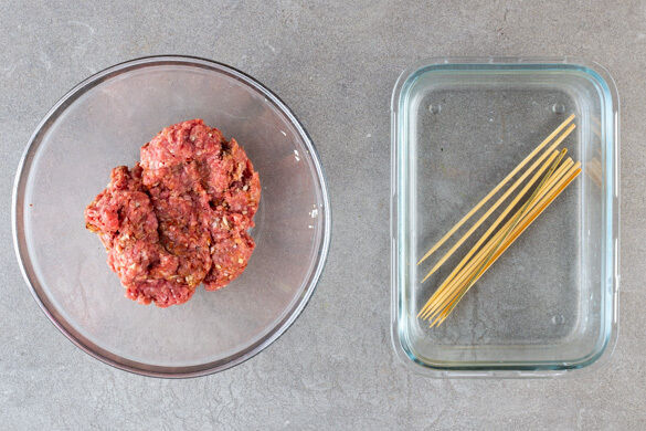 Die Hackfleischmasse zu 8 gleich großen Kugeln portionieren, diese in längliche Röllchen formen und auf die Spieße ziehen.