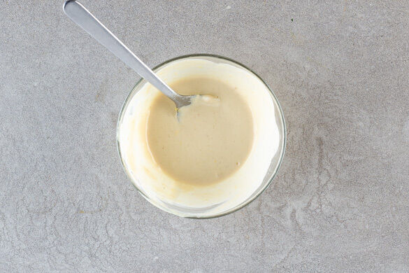 Die Zitronenschale abreiben, dann die Zitrone halbieren und auspressen. Den Zitronenabrieb und 2–3EL Zitronensaft mit der ½ der Tahinipaste, 1EL Olivenöl, 1EL Wasser und 1 Prise Salz verrühren.