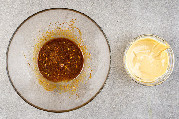 Falls verwendet, den Grill vorbereiten. 4 Schaschlikspieße in warmem Wasser einweichen. 1EL Olivenöl, 1EL Balsamicoessig und 1TL Senf zu einem Dressing verrühren. 2EL Mayonnaise mit 1TL Senf, ½TL Balsamicoessig und ½TL Wasser zu einem Dip verrühren.
