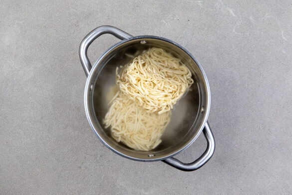 Die Nudeln in das kochende Wasser geben und in 3–5Min. bissfest kochen. Mit einer Tasse etwas Kochwasser abschöpfen, dann in ein Sieb abgießen und kalt abschrecken.