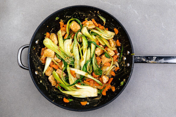 Die Karotten, die weißen Lauchzwiebelringe und den Ingwer in der Pfanne mit 1EL Pflanzenöl bei mittlerer bis starker Hitze ca. 3Min. anbraten, dann den Pak Choi zugeben und 1–2Min. mitgaren. Anschließend das Fleisch und die Sauce zugeben und ca. 2Min. köcheln lassen, bis das Fleisch gar ist.