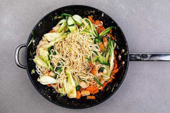 Wer unkompliziert kochen und schlemmen will, ist hier genau richtig: In die Pfanne hüpfen Karottenscheibchen, aromatischer Ingwer und Lauchzwiebeln sowie Pak Choi, eine grünblättrige chinesische Kohlart. Zartes Hähnchenfilet lässt sich auch nicht lange bitten, sich an dem bunten Speed Dating zu beteiligen. Dazu eine Erdnusssauce mit frischer Limette und süßlich-pikanter Chilisauce, leckere Weizennudeln – fertig!