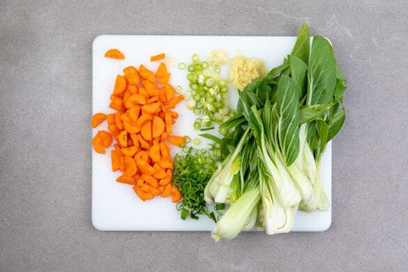 In einem mittelgroßen Topf ausreichend gesalzenes Wasser für die Nudeln zum Kochen bringen. Die Karotte ggf. schälen, längs halbieren und schräg in dünne Scheiben schneiden. Den grünen und den weißen Teil der Lauchzwiebel separat in feine Ringe schneiden. Den Ingwer und den Knoblauch schälen und fein würfeln oder reiben. Den Pak Choi längs in dünne Streifen schneiden.