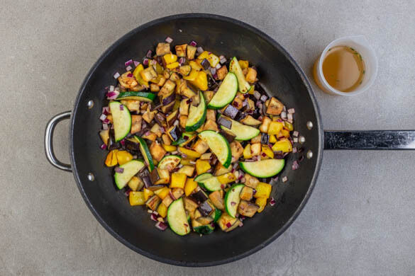 3EL Olivenöl in die Pfanne geben und die Auberginen- und Paprikastücke mit ½TL Salz bei starker Hitze ca. 2Min. anrösten. Dann die Zucchini und die Zwiebeln dazugeben und 2–3Min. mitbraten. Inzwischen die ½ des Brühgewürzes in 150ml warmem Wasser auflösen.