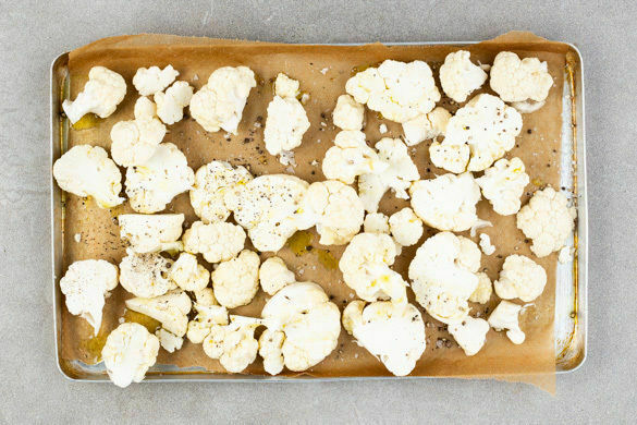 Den Blumenkohl mit 2EL Olivenöl und 1 kräftigen Prise Salz und Pfeffer vermengen, gleichmäßig verteilen und 10–12Min. auf der mittleren Schiene im Ofen rösten, dabei nach der Hälfte der Zeit wenden. Der Blumenkohl sollte eine schöne goldene Farbe bekommen.