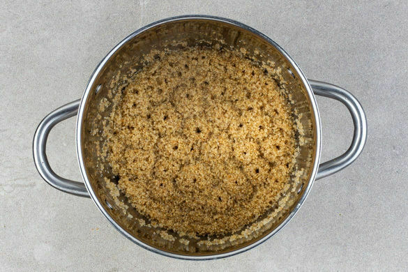 Die Quinoa in einem feinmaschigen Sieb mit warmem Wasser abspülen, in das kochende Wasser geben und 15–20Min. abgedeckt bei niedriger bis mittlerer Hitze sanft köcheln lassen. Vom Herd nehmen und bis zum Servieren warm halten.