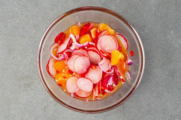 Die Mandarine schälen, dann die Segmente voneinander trennen und jeweils halbieren. Die Radieschen in dünne Scheiben schneiden und mit den Mandarinenstücken und dem Dressing vermengen.