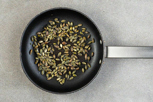 Inzwischen die Kürbiskerne in einer großen Pfanne ohne Zugabe von Fett bei mittlerer Hitze 2–4Min. anrösten, bis sie knistern und goldbraun sind, anschließend in ein hohes Gefäß geben. Die Pfanne aufbewahren.