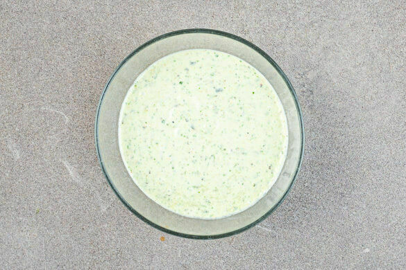 Den Knoblauch schälen und halbieren. Den Koriander samt Stängeln grob schneiden. Einige Korianderblätter für die Garnitur beiseitelegen. Den übrigen Koriander, 2 Knoblauchhälften, den Käse, den Joghurt und 1EL hellen Essig in das Gefäß mit den Kürbiskernen geben und alles cremig pürieren. Mit Salz und Pfeffer abschmecken. Den übrigen Knoblauch fein würfeln.