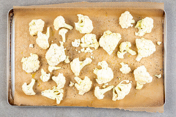 Den Backofen auf 230°C (210°C Umluft) vorheizen. In einem mittelgroßen Topf ausreichend gesalzenes Wasser für die Pasta zum Kochen bringen. Den Blumenkohl in mundgerechte Röschen schneiden und auf einem mit Backpapier ausgelegten Backblech mit 1EL Olivenöl und 1 kräftigen Prise Salz vermengen. Die Blumenkohlröschen im Ofen ca. 15Min. rösten, bis sie bissfest und leicht gebräunt sind.