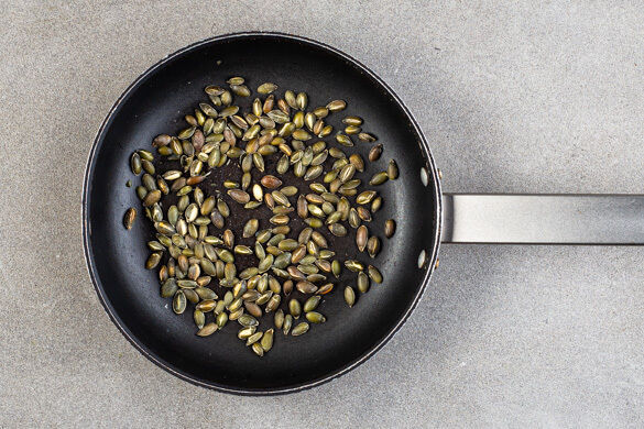 Inzwischen die Kürbiskerne in einer mittelgroßen Pfanne ohne Zugabe von Fett bei mittlerer Hitze 2–4Min. anrösten, bis sie knistern und goldbraun sind, anschließend in ein hohes Gefäß geben. Die Pfanne aufbewahren.