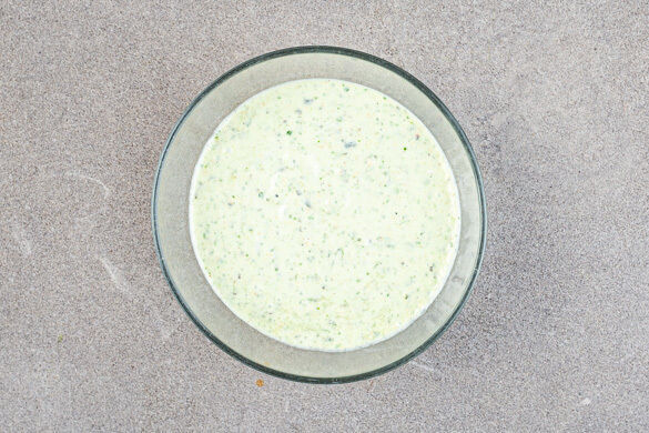 Den Knoblauch schälen und halbieren. Den Koriander samt Stängeln grob schneiden. Einige Korianderblätter für die Garnitur beiseitelegen. Den übrigen Koriander, 1 Knoblauchhälfte, den Käse, den Joghurt und ½EL hellen Essig in das Gefäß mit den Kürbiskernen geben und alles cremig pürieren. Mit Salz und Pfeffer abschmecken. Den übrigen Knoblauch fein würfeln.