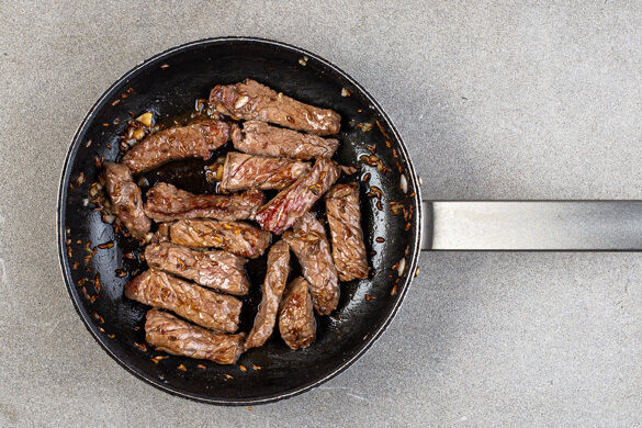 Das Fleisch trocken tupfen und in der Pfanne mit 1EL Olivenöl und der ½ der Gewürzmischung bei mittlerer bis starker Hitze in ca. 4Min. rundum goldbraun anbraten. Den gewürfelten Knoblauch unterrühren und ca. 1Min. mitbraten, dann die Pfanne vom Herd nehmen und das Fleisch mit Salz abschmecken.