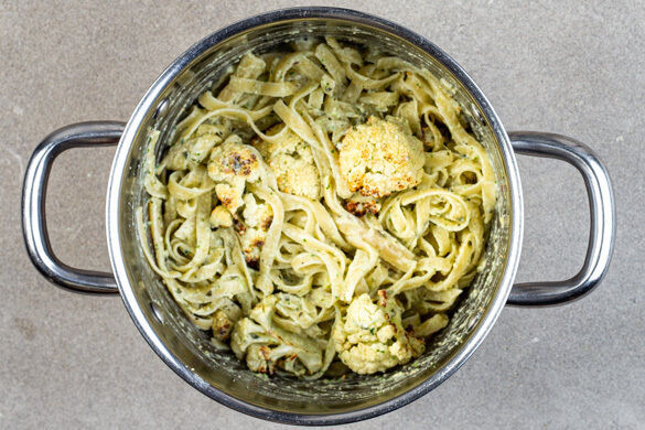 Ein orientalischer Hauch liegt über diesem reizvollen Pastagericht: Zarte Blumenkohlröschen und Tagliatelle schmiegen sich an ein elegantes Pesto aus Joghurt, aromatischem Koriander, Kürbiskernen und leckerem Hartkäse. Als köstliches Highlight präsentieren sich zart gebratene Rinderstreifen mit Kreuzkümmelgewürz kontrastvoll auf dem Nudelteller. Schade, dass dieses kulinarische Kunstwerk nur von kurzer Dauer ist!