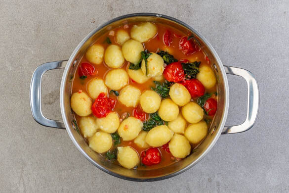 Das restliche Brühgewürz in das kochende Wasser geben, ggf. mit Salz nachwürzen. Die Gnocchi in die Brühe geben und 2–3Min. kochen lassen, bis sie gar sind und an der Oberfläche schwimmen. Ca. 100ml Kochwasser abschöpfen, dann die Gnocchi in ein Sieb abgießen und abtropfen lassen.