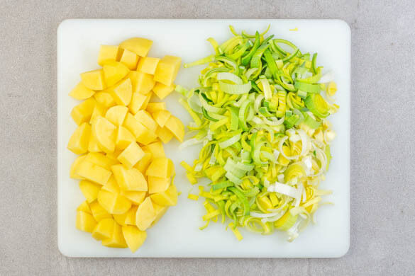 Den Lauch in feine Ringe schneiden. Die Kartoffeln schälen und in ca. 1cm große Würfel schneiden.